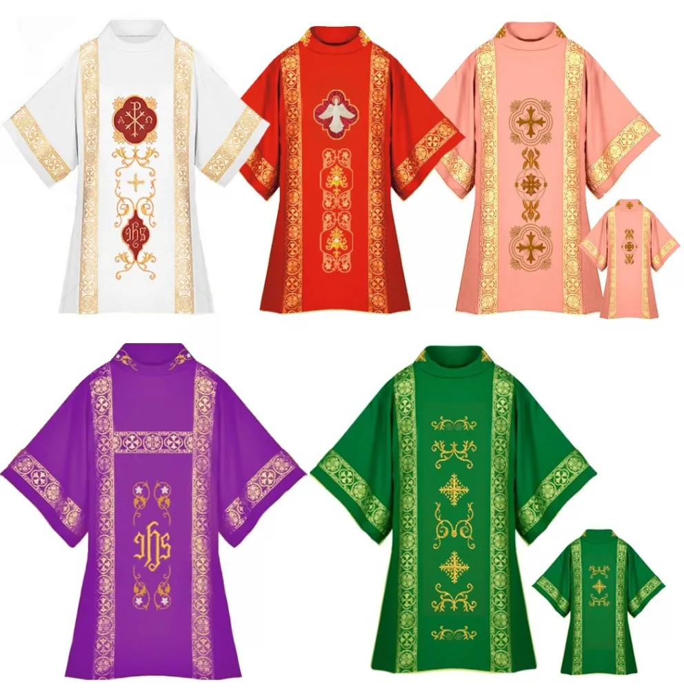 - Conjunto de 5 Dalmaticas confeccionada em tecido Oxford Importado 100% Polyester, bordadas frente e costas. Acabamento em viés em toda a dalmatica.
