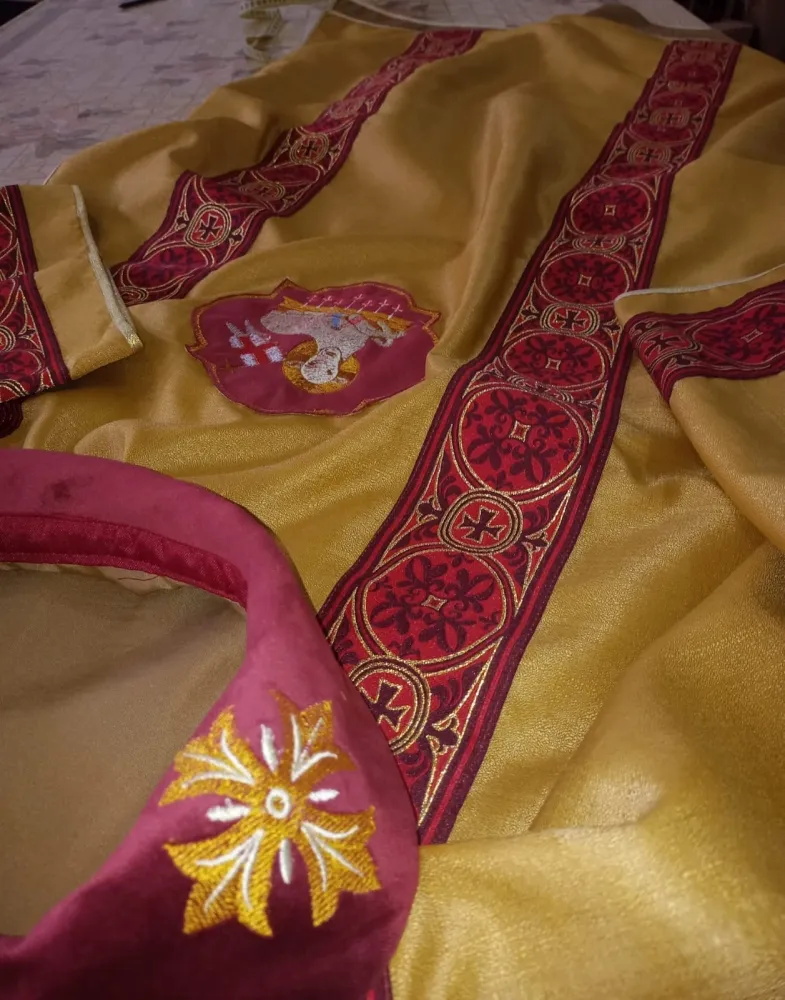 - Dalmatica confeccionada em tecido Jacquard, bordada gola em veludo vermelho, e galões liturgicos vermelho com dourado. Aplique central Bordado no peito em veludo .