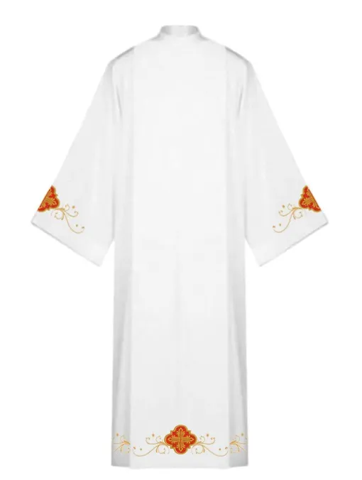 Túnica branca em gambardini leve ou oxford. Ziper lateral no ombro com pregas tradicionais estilo escapulario.